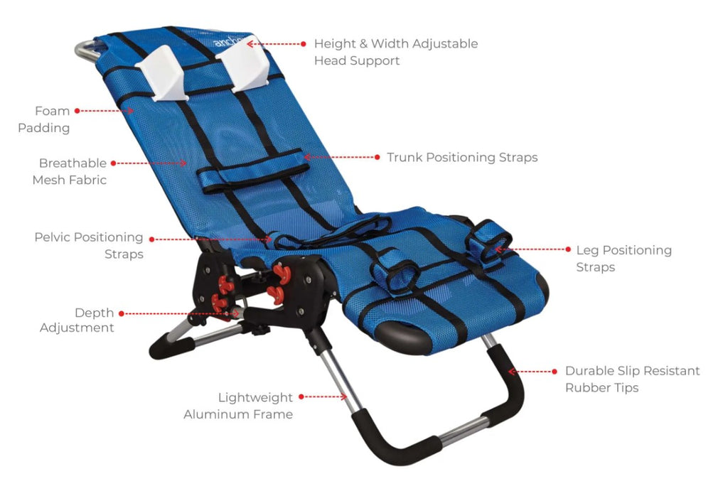 - Flexible Support System: Positioning straps and head support can be placed anywhere along the chair’s length for optimal alignment and security.