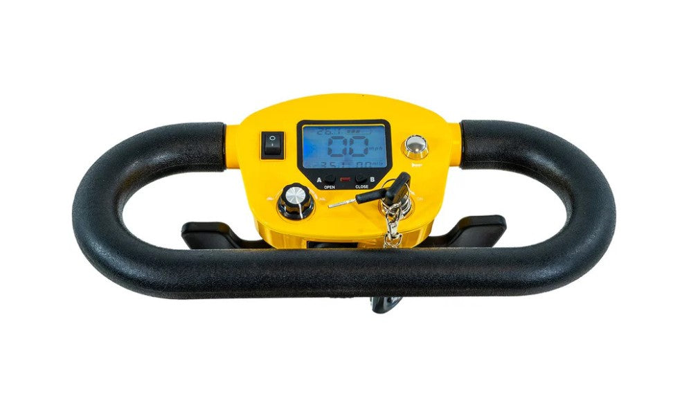 Designed for a smooth and comfortable ride, the Transformer 2 comes with front and rear suspension, a roomy padded seat with folding armrests, and a two-way adjustable tiller for personalized positioning. The keyed control unit with paddle acceleration, speed control, horn, and USB charger makes operation simple and safe, while the modern digital display tracks battery life, speed, and distance. With a top speed of 3.7–4 mph and a bright LED headlight, this durable, stable, 4-wheel scooter is ready to take you anywhere.