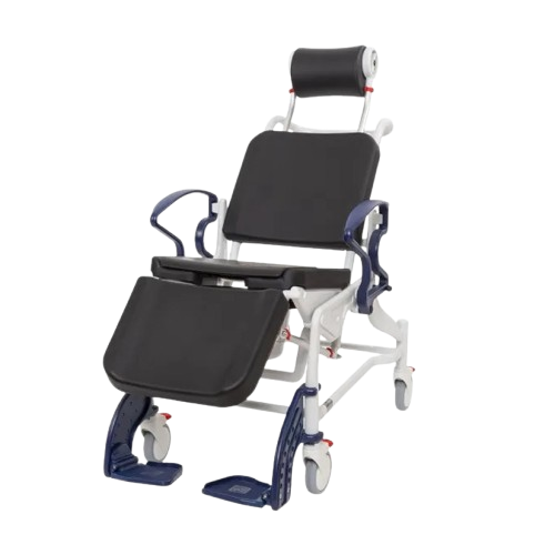 Crafted with soft PUR cushioning on the seat, back, and leg support, the Phoenix provides maximum comfort during bathing or toileting. Its height-adjustable and removable footrests accommodate different user needs, while swing-away armrests allow effortless side transfers for added safety and independence. The PUR offset adjustable headrest offers customizable support, ensuring comfort for patients during extended use.